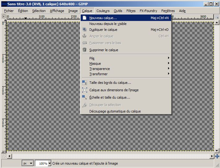 La création se fait par le menu : |Calques>Nouveau Calque… ou CTRL+Shift+N.
