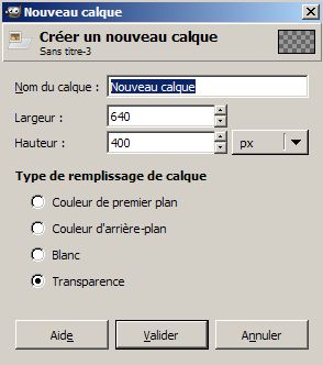 Gimp propose à ce stade un panneau permettant de choisir les caractéristiques du calque. La sélection par défaut créera un calque transparent de la même taille que l’image ce qui est l’usage le plus courant. Une pression sur la touche « entrée » valide la création.