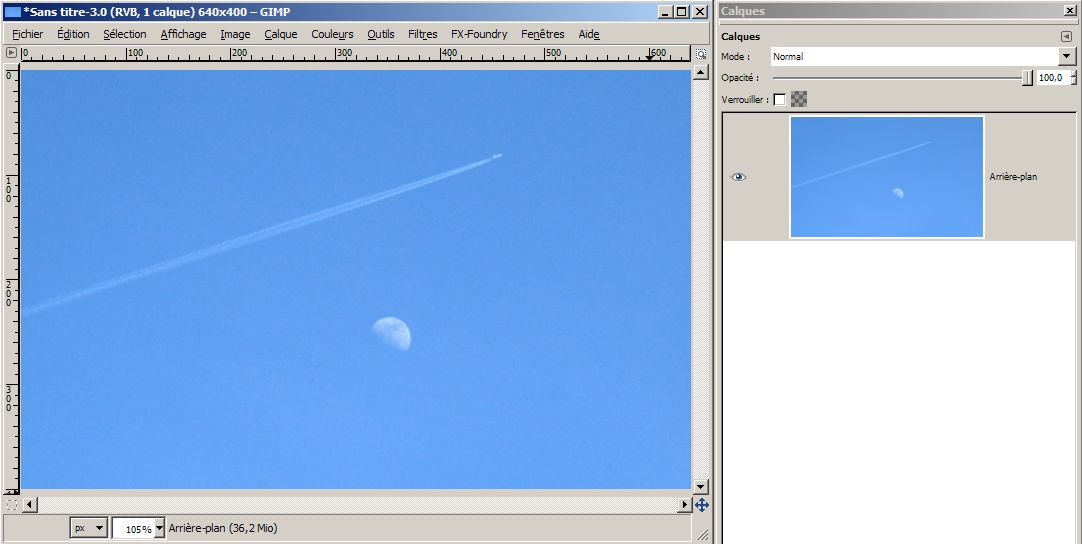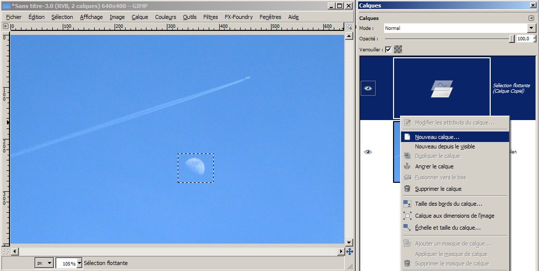 Copier/coller! On obtient une « sélection flottante ». Ce n’est pas un calque. Pourquoi ne pas faire un calque directement ? C’est une sélection de pixel que l’on peut repositionner (par exemple) dans l’image avant d’en faire un claque aux dimensions de l’image. Cela sert peu dans l’édition d’image panoramique. Toutefois c’est une fonctionnalité incontournable pour nombre d’infographistes. Il suffit de faire un clic droit sur le calque (dans la palette « calques ») pour le transformer en calque flambant neuf.