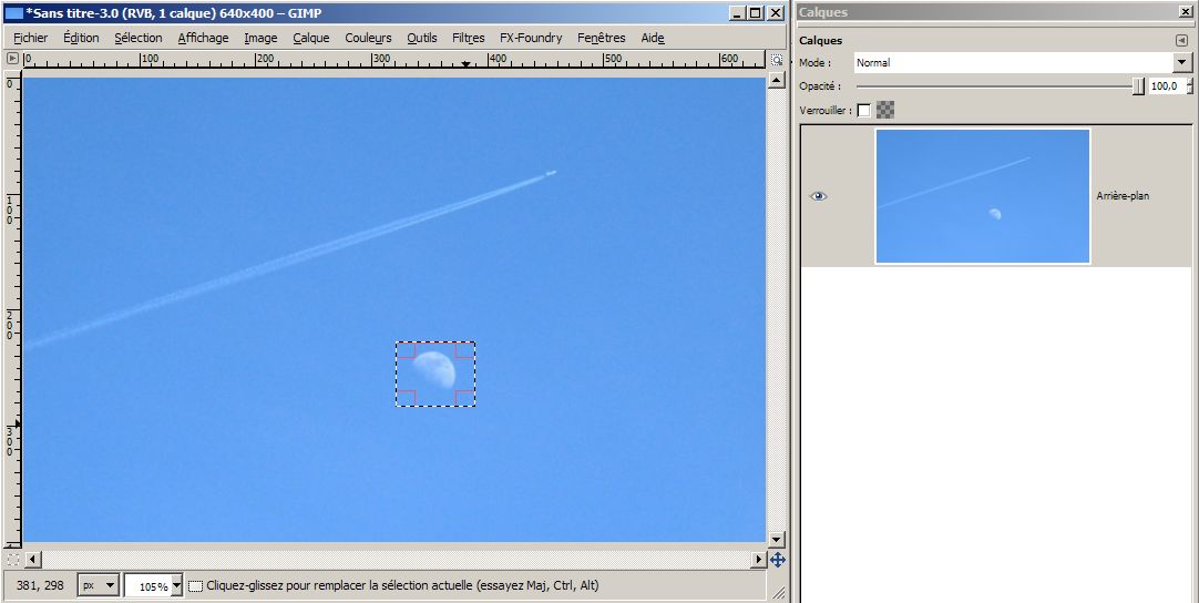 Dans l’exemple suivant une sélection de la lune. L’outil est paramétrable pour qu’il tolère un seuil pour lequel il ne sélectionnera pas un pixel s’il est trop éloigné (en termes de couleur). En maintenant le clic et en faisant glisser la souris on peut changer le seuil de tolérance à la volée. C’est plus pratique que de modifier l’option dédiée de l’outil.