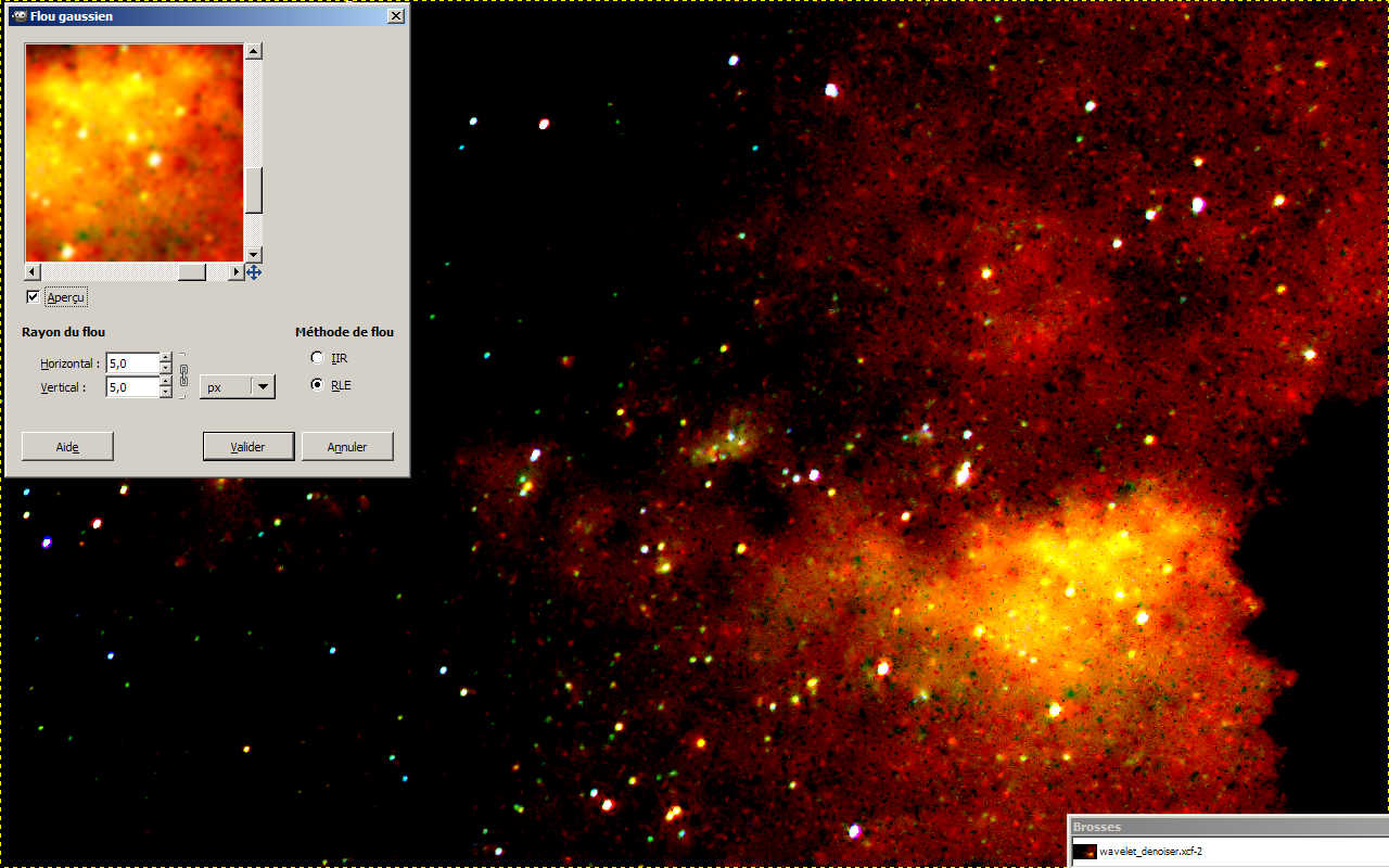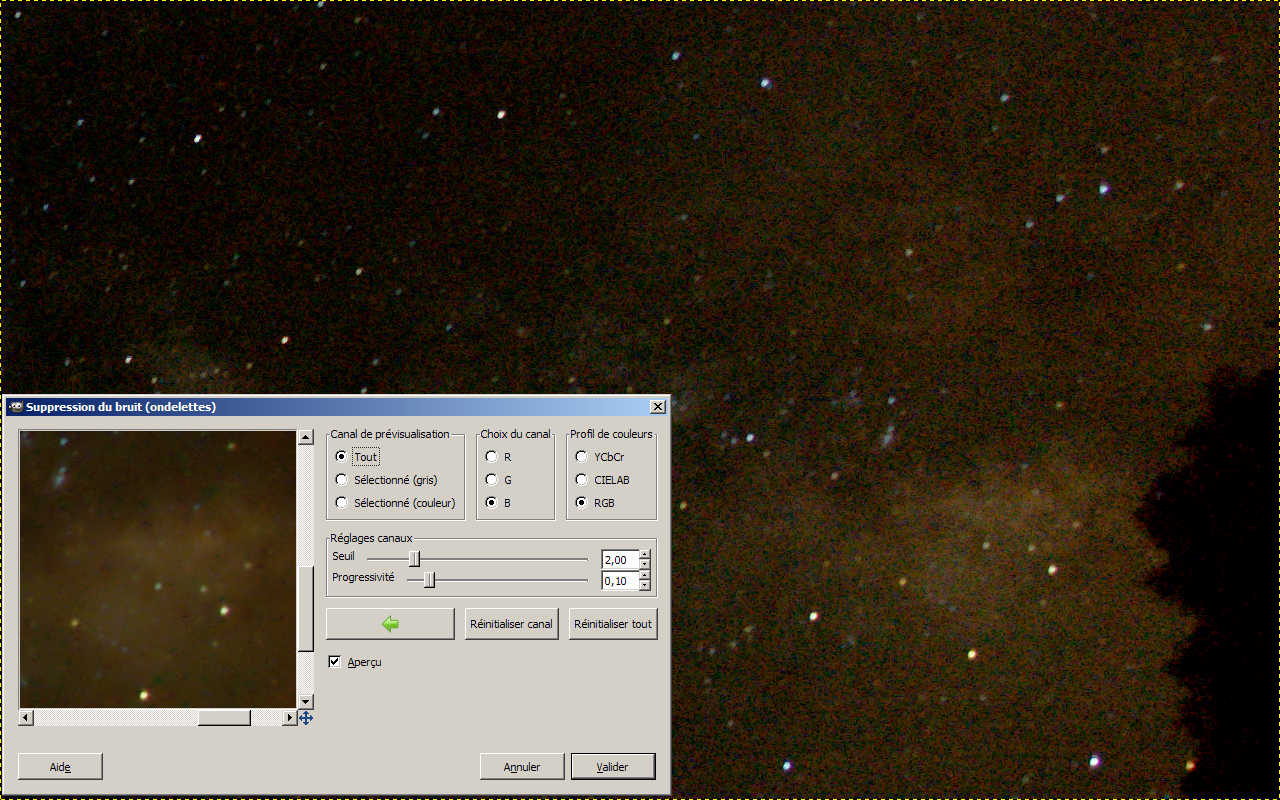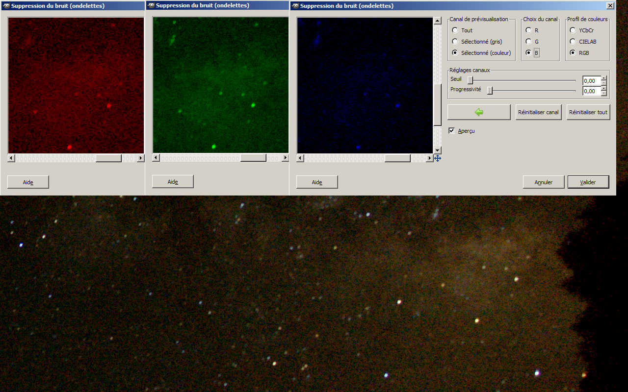On voit déjà ressortir les volutes de la voie lactée. Maintenant on peut activer le filtre sur ce même calque pour travailler un peu sur ce bruit qui est encore bien présent. Le filtre, une fois installé se trouve dans |Filtres>Amélioration>Débruitage (ondelettes) L’interface propose plusieurs modes de vue qui permettent d’avoir un aperçu des traitements. Il est très intéressant de prendre le mode RGB et de regarder ce que cela donne pour chaque couleur.