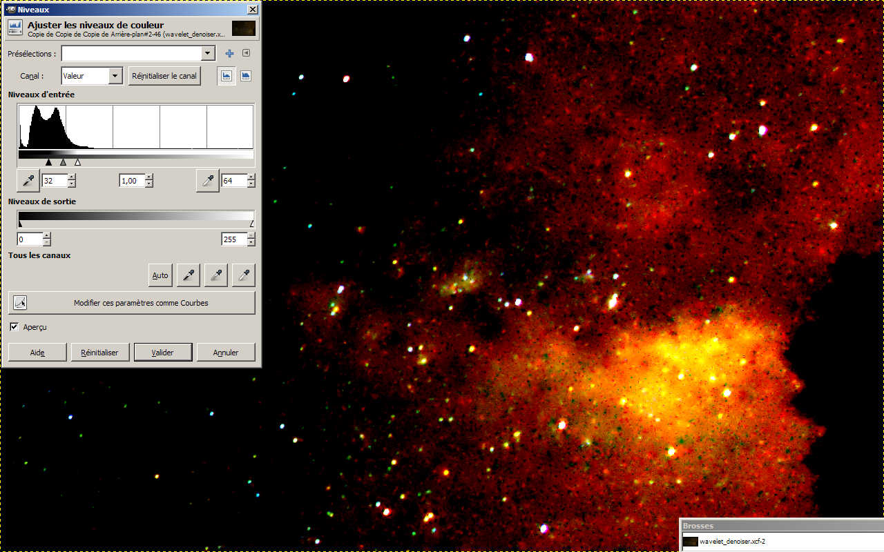 Il faut d’abord se débarrasser du bruit que l’on sait être près des « noirs ». Cela facilite un peu les choses pour la suite. Dans l’exemple il est situé sur les tons de 0 à 32. Sur une copie du calque on applique |Couleurs>Niveaux…