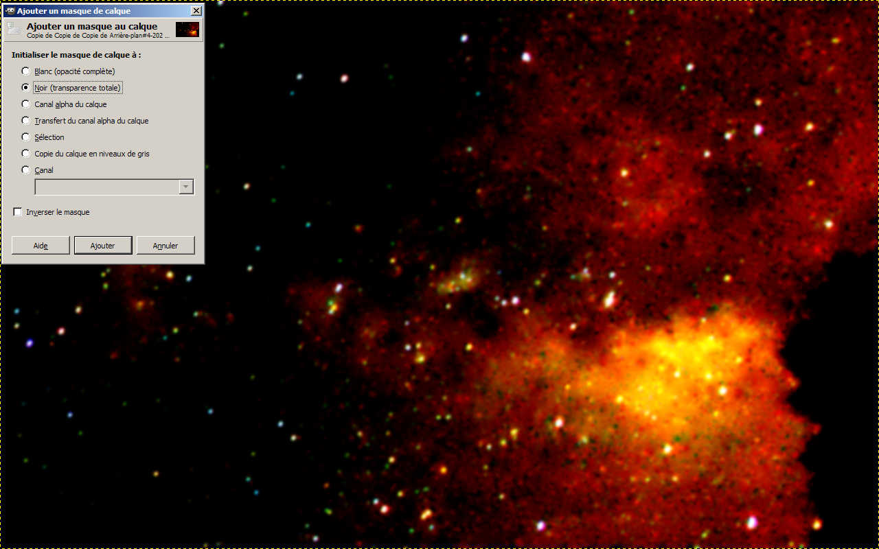 Avec ce nouveau calque de la voie lacté, on va pouvoir commencer à séparer les noirs et le rendre transparent. Sur ce calque, il faut « ajouter un canal Alpha » via le menu contextuel puis ajouter un masque de calque. Il faut s’assurer que ce calque est au-dessus de tous les autres. Le mode du masque qui nous intéresse est « Noir = transparence totale ».