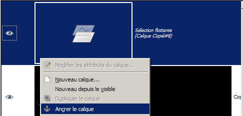 On obtient une sélection flottante qui ira se loger dans le masque une fois que l’on va l’ancrer. Pour cela il suffit de faire un clic droit et de choisir « Ancrer le calque ». Accessoirement on peut « appliquer le masque de calque » (menu contextuel du masque). Il remplacera le canal Alpha du calque.