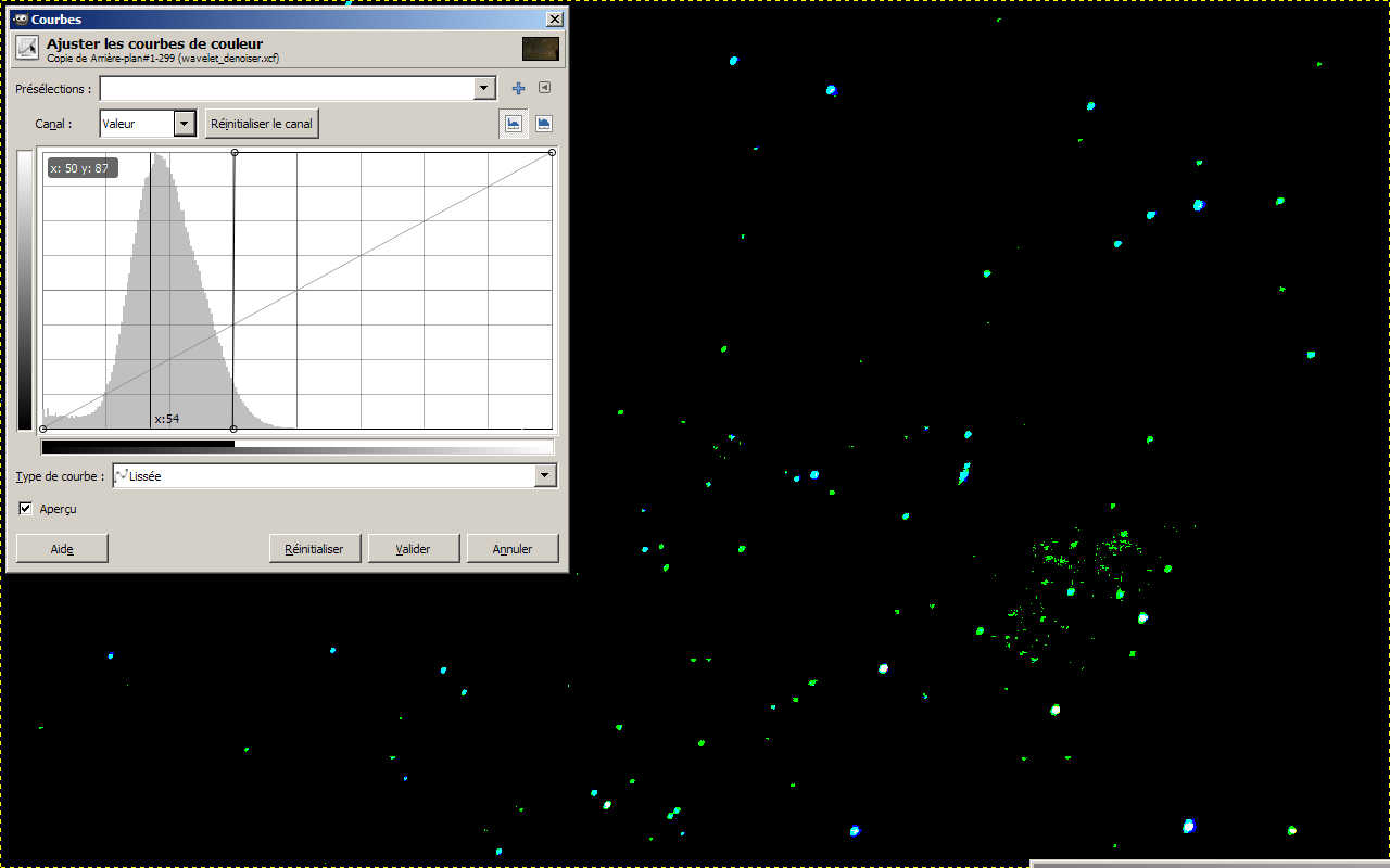 - Appliquer une courbe de couleur (|Couleurs>courbes…) de manière à obtenir une nouvelle sélection d’étoiles.
